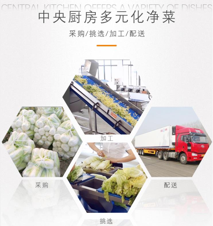 而中央廚房凈菜加工廠生產線設備多元化,有洗潔凈高、節能、節水、干凈衛生、不損壞蔬菜、效果高、設備穩定可靠能保持原有色澤等特點。流水線生產作業過程中產出的漂浮物是可以從設備的溢流槽裝置溢出的,并且產出的沉淀物也是可以從設備的排污口排出,以達到流水線自動清洗的目的。蔬菜的清洗加工廠的流程:蔬菜→分選→切割→清洗→過濾→切制→二次清洗→瀝水→風干→挑選→計量→包裝→金屬檢測→裝箱→入庫。